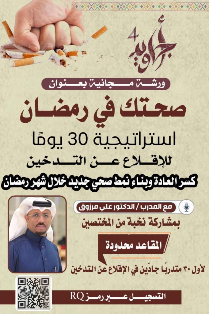 هذه الورشة جاءت بعنوان «استراتيجية 30 يومًا للإقلاع عن التدخين»، واستهدفت إقلاع 30 متدربًا عن التدخين خلال 30 يومًا في شهر رمضان المبارك، بالشراكة مع 30 جهة؛ لتحقيق 30 هدفًا متكاملًا تتوزع بين الاهداف الصحية، والسلوكية، والاجتماعية، والأسرية، والنفسية.