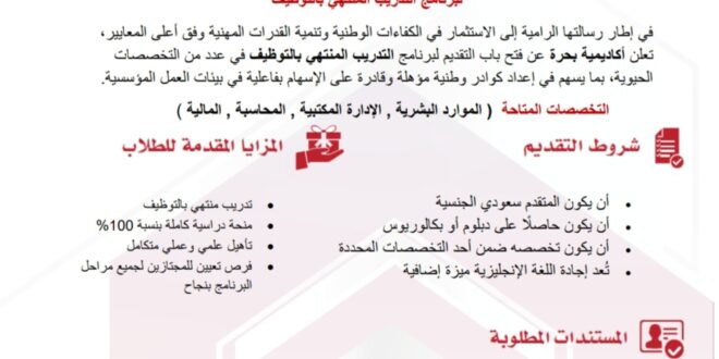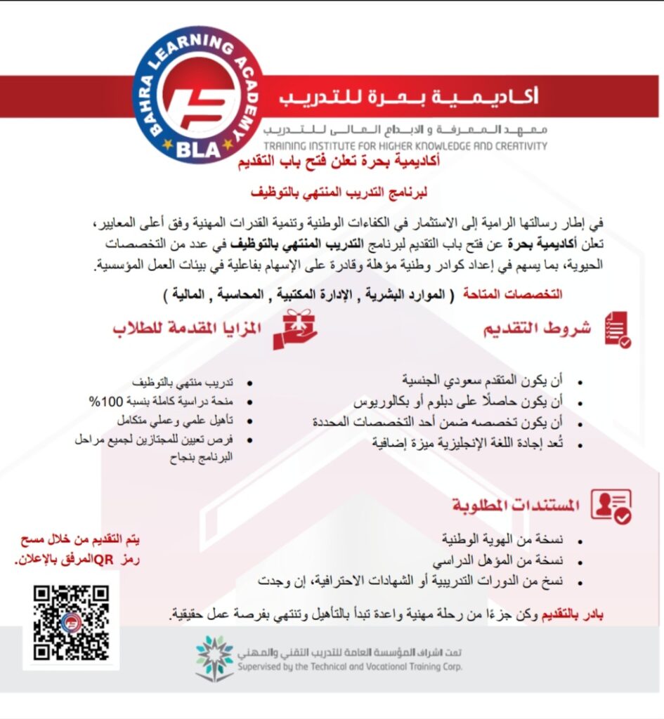 ​أعلنت أكاديمية بحرة للتدريب (معهد المعرفة والإبداع العالي للتدريب) عن فتح باب التقديم لبرنامج “التدريب المنتهي بالتوظيف”، والذي يستهدف تأهيل الكوادر الوطنية الشابة للمساهمة بفعالية في بيئات العمل المؤسسية، وذلك ضمن رؤيتها الرامية إلى الاستثمار في الكفاءات وتنمية القدرات المهنية وفق أعلى المعايير.