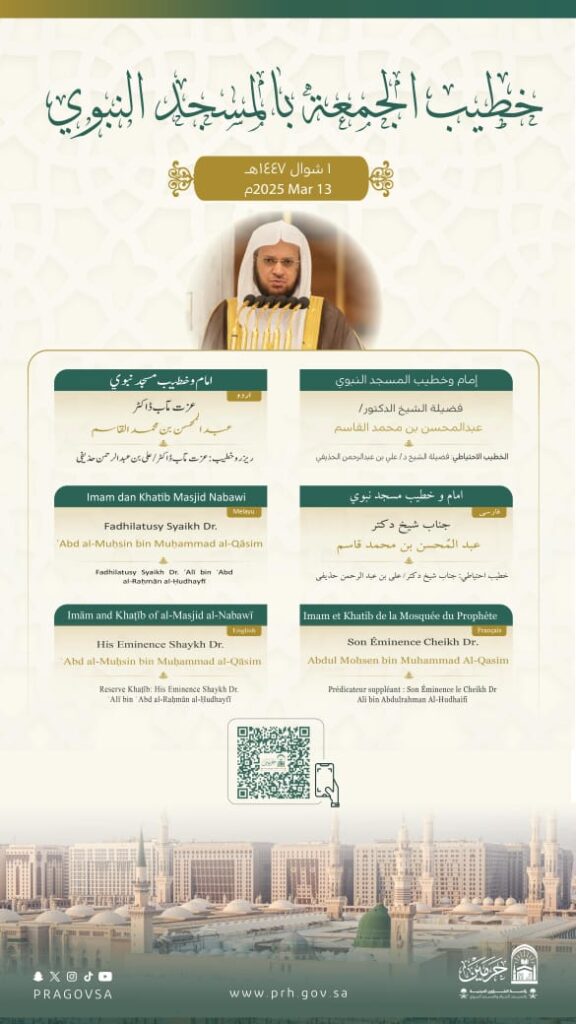 فيما يخطب ويؤم المصلين في المسجد النبوي فضيلة الشيخ الدكتور عبدالمحسن القاسم