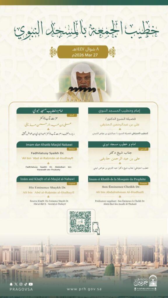 فيما يخطب ويؤم المصلين في المسجد النبوي فضيلة الشيخ الدكتور علي الحذيفي