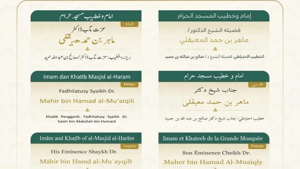 وسيتولى فضيلة الشيخ الدكتور ماهر المعيقلي بإمامة المصلين وإلقاء خطبة الجمعة في المسجد الحرام.