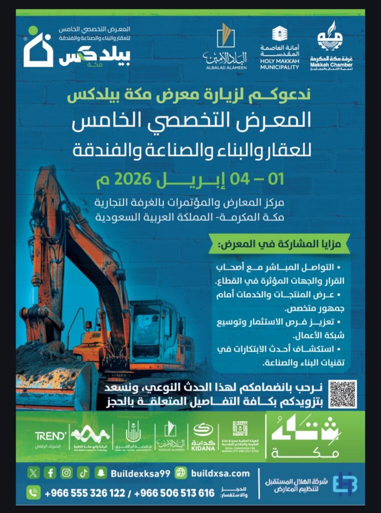 ​تتجه أنظار صناع القرار ورواد قطاع التشييد والبناء نحو العاصمة المقدسة، حيث ينطلق المعرض التخصصي الخامس للعقار والبناء والصناعة والفندقة (مكة بيلدكس 2026)، في تظاهرة اقتصادية كبرى تجمع تحت سقف واحد أحدث الابتكارات والتقنيات التي تشكل مستقبل العمران في المنطقة.
