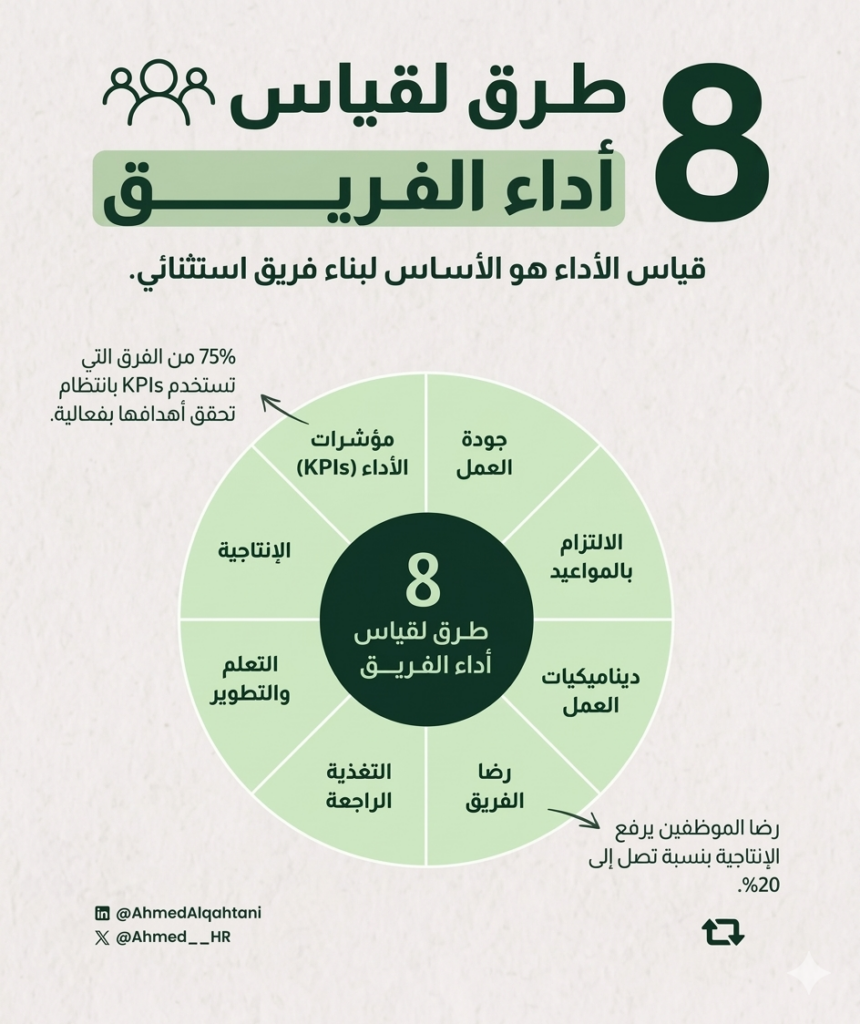 • التعلم والتطوير: قياس مدى اكتساب الفريق لمهارات جديدة يضمن بقاء المنظمة في دائرة المنافسة والابتكار.