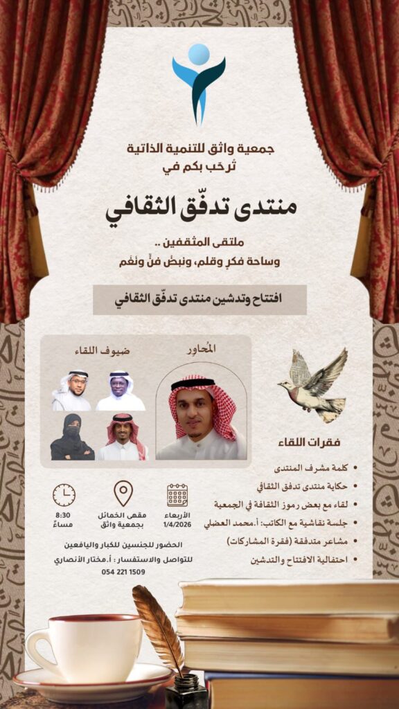 في ظل الدعم اللامحدود الذي يحظى به القطاع الثقافي والاجتماعي من لدن خادم الحرمين الشريفين الملك سلمان بن عبدالعزيز وولي عهده الأمين الأمير محمد بن سلمان حفظهم الله، أعلنت جمعية واثق للتنمية الذاتية عن عودة وانطلاقة برنامجها النوعي “منتدى تدفق الثقافي”.