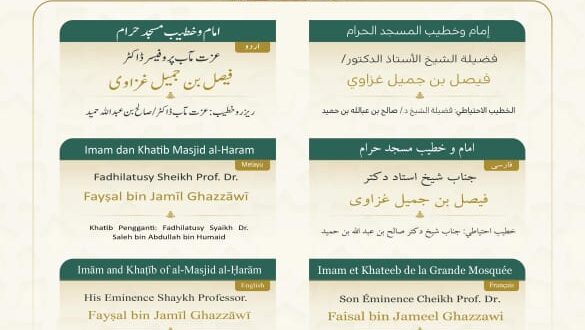 أوضحت رئاسة الشؤون الدينية بالمسجد الحرام والمسجد النبوي أسماء خطيبا وإماما صلاة الجمعة في الحرمين الشريفين ليوم بعد غد الجمعة 15 شوال 1447هـ، وذلك ضمن جدولها الدوري لتنظيم الإمامة والخطابة.