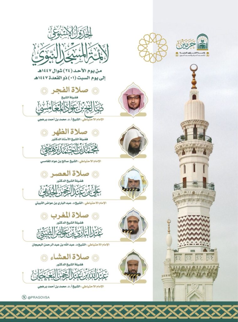 حددت رئاسة الشؤون الدينية بالمسجد الحرام والمسجد النبوي الجدول الأسبوعي لأصحاب الفضيلة أئمة الحرمين الشريفين، للفترة من اليوم الأحد 24 شوال إلى يوم السبت القادم 1 ذو القعدة 1447هـ، وذلك ضمن جهودها في تنظيم الصلوات وتيسير متابعتها لعموم المصلين والزوار.