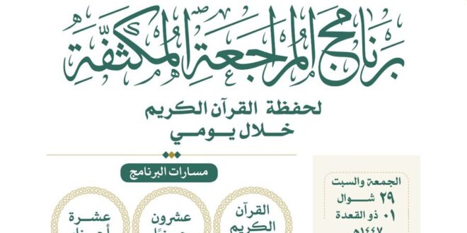 أوضحت رئاسة الشؤون الدينية بالمسجد الحرام والمسجد النبوي، ممثلةً في إدارة حلقات القرآن الكريم والمتون العلمية بالمسجد النبوي، عن إقامة برنامج المراجعة المكثفة لحفظة القرآن الكريم، وذلك خلال يومي الجمعة والسبت 29 شوال و1 ذي القعدة 1447هـ، ضمن جهودها الرامية إلى تعزيز تعليم القرآن الكريم ونشر قيمه الوسطية بين قاصدي مسجد رسول الله صلى الله عليه وسلم.