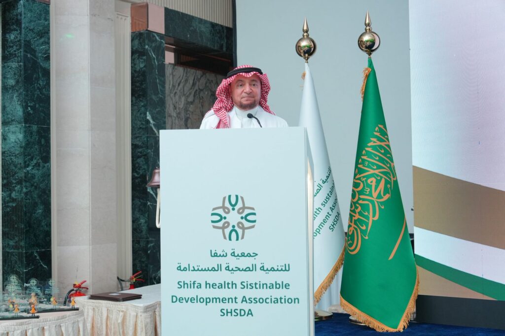 ثم قدم د/ زهير عبد الرحيم ميمني الرئيس التنفيذي لجمعية شفا شرحاً موجزا عن جمعية شفا والتي تأسست بتصريح رقم 2251 من المركز الوطني لتنمية القطاع غير الصحي وتحت الإشراف الفني من وزارة الصحة والمبادرات الأربعة التي تم تدشينها في الحفل وهي: