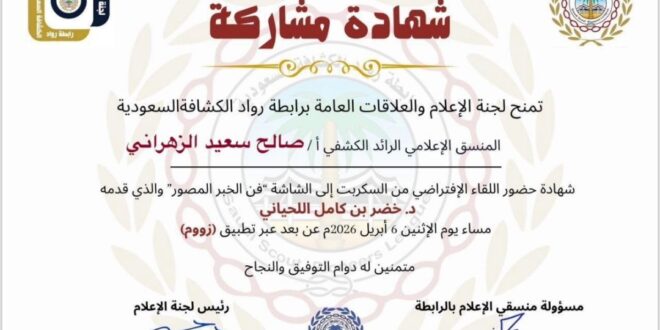 “من السكربت إلى الشاشة: فن الخبر المصور” وأوضح مدير المكتب بأن الزهراني من الرواد الكشفيين المميزين وداعيا له الله بدوام التوفيق والنجاح في مشواره مع رواد كشافة محافظة جدة
