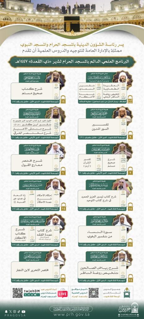 أوضحت رئاسة الشؤون الدينية بالمسجد الحرام والمسجد النبوي عن جدول البرنامج العلمي الدائم في المسجد الحرام لشهر ذي القعدة 1447هـ . والذي يأتي امتدادًا لجهودها المتواصلة في نشر العلم الشرعي وتعزيز الوعي الديني لدى قاصدي الحرمين الشريفين.