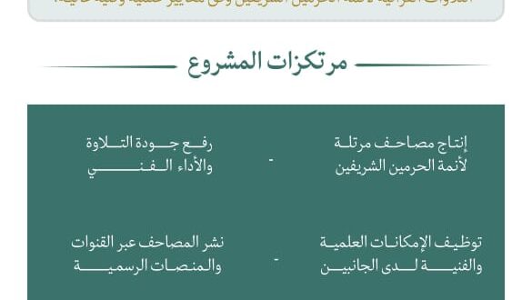 وبيّنت أن المشروع يجسد التكامل المؤسسي في خدمة كتاب الله تعالى، ويعكس توظيف الإمكانات الإعلامية والتقنية الحديثة لإيصال التلاوات القرآنية بجودة عالية إلى مختلف شرائح المستمعين داخل المملكة وخارجها، بما يعزز حضور رسالة الحرمين الشريفين الوسطية عالميًا.