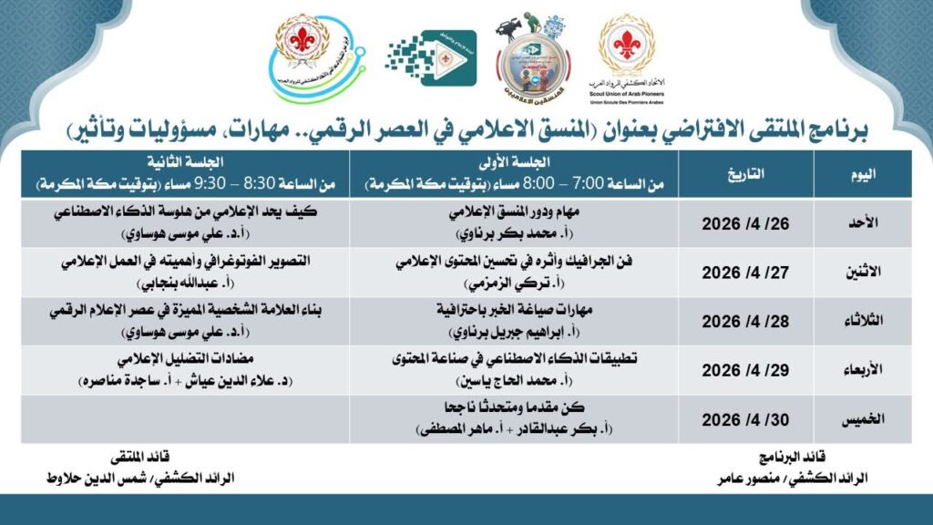 يمتد البرنامج خلال الفترة من 26 إلى 30 أبريل 2026، ويهدف إلى تمكين الممارسين الإعلاميين من أدوات العصر الحديث وتعزيز قدراتهم على إدارة المحتوى الرقمي بفاعلية واحترافية.
