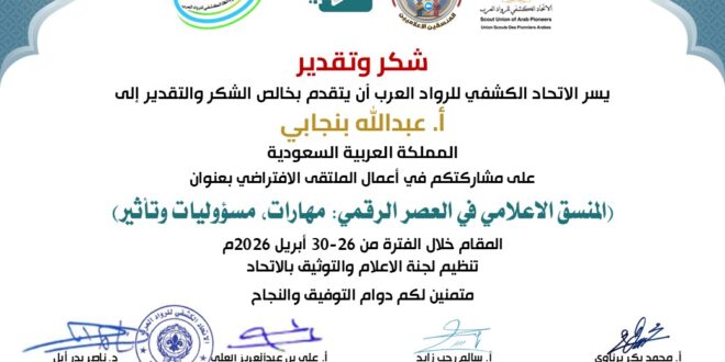 في لفتة تقديرية تعكس عمق التعاون والتميز المهني، قدم الاتحاد الكشفي لرواد العرب شهادة شكر وتقدير للأستاذ عبدالله بنجابي، وذلك تقديراً لمشاركته الفاعلة والمتميزة في أعمال الملتقى الافتراضي الذي عُقد تحت عنوان: