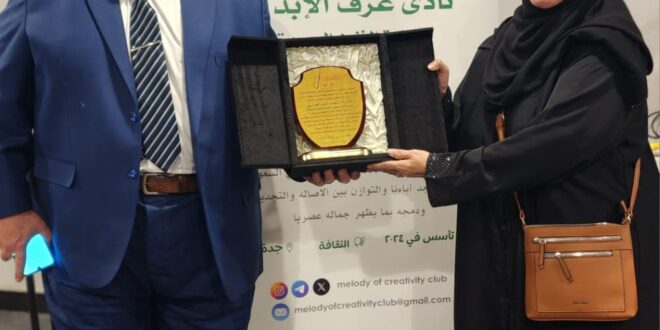 وتم تكريم الفنان الحسيني من قبل قائدة نادي عزف الإبداع الاستاذة ليلى مداح شكرا وتقديرا للاستاذ الحسيني على جهوده المثمنه .