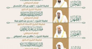 منصور نظام الدين –عبدالله بنجابي: مكة المكرمة:- حددت رئاسة الشؤون الدينية بالمسجد الحرام والمسجد النبوي الجدول الأسبوعي لأئمة الحرمين الشريفين للفترة من يوم غد الأحد 9 جمادى الآخرة إلى يوم السبت القادم 15 جمادى الآخرة 1447هـ، وذلك ضمن جهودها لتنظيم جداول الصلوات وتيسير متابعتها لعموم المصلين والزوار. وجاء جدول أئمة المسجد الحرام على النحو الآتي:صلاة الفجر: فضيلة الشيخ الدكتور بندر …