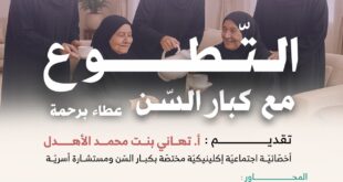 نوال مسلم :مكة المكرمة:- ضمن الأنشطة والبرامج والفعاليات والمبادرات الهادفة التي تقيمها جمعية يسر للتنمية الأسرية بمكة المكرمةوتزامنًا مع اليوم العالمي لكبار السن – تقيمالجمعية يُسر لقاء ضمن مبادرة بركتنا بعنوان( التّطوع مع كبار السّن: عطاء برحمة )أوضحت ذلك الأستاذة الدكتورة هيفاء عثمان فدا – رئيسة مجلس إدارة الجمعيةوأشارت بأن محاور اللقاء تتضمن:مفهوم التّطوع واثره في المجتمع.مكانة كبار السّن في …