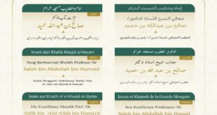 منصور نظام الدين –عبدالله بنجابي : مكة المكرمة:- حددت رئاسة الشؤون الدينية بالمسجد الحرام والمسجد النبوي أسماء خطيبا وإماما صلاة الجمعة في الحرمين الشريفين ليوم 22 شوال 1447هـ، وذلك ضمن جدولها الدوري لتنظيم الإمامة والخطابة.وسيتولى معالي الشيخ الدكتور صالح بن حميد إمامة المصلين وإلقاء خطبة الجمعة في المسجد الحرام، فيما يخطب ويؤم المصلين في المسجد النبوي فضيلة الشيخ الدكتور خالد …