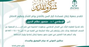 مكة المكرمة: نوال مسلم كرّمت جمعية “إجلال” لمساندة كبار السن بمحافظة الأفلاج، المستشار الإعلامي الدكتور منصور نظام الدين قريشي، تقديراً لجهوده الإعلامية البارزة ودوره الفاعل في تعزيز رسالة الجمعية وإبراز مناشطها المختلفة. جاء هذا التكريم نظير التعاون البنّاء والمتميز الذي قدمه الدكتور منصور في نشر أخبار الجمعية عبر مختلف الوسائل الإعلامية، لا سيما خلال زيارة وفد الجمعية إلى مكة المكرمة …