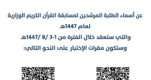 نوال مسلم :الطائف:- أوضحت الإدارة العامة للتعليم في الطائف أسماء الطلاب والطالبات المرشحين لمسابقة القرآن الكريم الوزارية لعام 1447هـ والبالغ عددهم 500 طالب وطالبة على مستوى إدارة تعليم الطائف والتي تستمر لمدة 3 أيامفي جميع فروع المسابقةوأوضح المدير العام للتعليم في الطائف الدكتور سعيد بن عبدالله الغامدي : أن المسابقة تهدف إلى تشجيع الطلاب والطالبات وتحفيزهم على التنافس في حفظ …