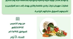 منصور نظام الدين –عبدالله بنجابي :مكة المكرمة:- يستعد مكتب وزارة البيئة والمياه والزراعة بمحافظة الجموم لإطلاق فعاليات مهرجان خيرات وادي فاطمة 2025، الذي يقام برعاية محافظ الجموم الأستاذ محمد بن ماضي السبيعي، وذلك يوم الخميس 12 ربيع الأول 1447هـ الموافق 4 سبتمبر 2025م، ولمدة ثلاثة أيام، بمشاركة الجهات الحكومية والمزارعين والأهالي.ويستعرض المهرجان إنتاج المحافظة الزراعي، من خلال منتجات التمور والخضار …