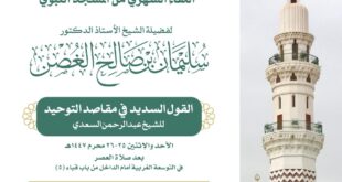 منصور نظام الدين –عبدالله بنجابي: المدينة المنورة:- تقيم رئاسة الشؤون الدينية بالمسجد الحرام والمسجد النبوي اللقاء العلمي الشهري، الذي يُعقد في رحاب المسجد النبوي الشريف، ويقدّمه فضيلة الشيخ الأستاذ الدكتور سليمان صالح الغصن، أستاذ العقيدة بجامعة الإمام محمد بن سعود الإسلامية.ويتناول اللقاء محورين علميين على مدى يومين، هما:القول السديد في مقاصد التوحيد لفضيلة الشيخ عبد الرحمن السعدي – بعد صلاة …
