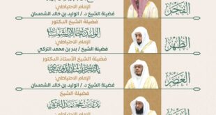 منصور نظام الدين –عبدالله بنجابي: مكة المكرمة:- أعتمدت رئاسة الشؤون الدينية بالمسجد الحرام والمسجد النبوي الجدول الأسبوعي لأصحاب الفضيلة أئمة الحرمين الشريفين، للفترة من 27 إلى 29 شعبان 1447هـ وذلك ضمن جهودها لتنظيم الصلوات وتيسير متابعتها لعموم المصلين والزوار. أولًا: جدول أئمة المسجد الحرام:صلاة الفجر: معالي الشيخ الدكتور صالح بن حميدصلاة الظهر: فضيلة الشيخ الدكتور الوليد الشمسانصلاة العصر: فضيلة الشيخ …