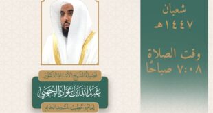 منصور نظام الدين –عبدالله بنجابي : مكة المكرمة:- حددت رئاسة الشؤون الدينية بالمسجد الحرام والمسجد النبوي أسماء خطيبا وإماما صلاة الاستسقاء في الحرمين الشريفين ليوم غد الخميس 24 شعبان 1447هـ وذلك ضمن جدولها الدوري لتنظيم الإمامة والخطابة.وسيتولى فضيلة الشيخ الأستاذ الدكتور عبدالله الجهني إمامة المصلين وإلقاء الخطبة في المسجد الحرام وذلك عند الساعة 7:08 صباحًا.فيما يخطب ويؤم المصلين في المسجد …