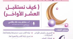 نوال مسلم: مكة المكرمة:- ضمن الأنشطة والبرامج والفعاليات والمبادرات التوعوية والتثقيفية التي تنفذها جمعية يسر للتنمية الأسرية بمكة المكرمةوضمن مبادرة هندسة الأسرة في برنامج ( ارتواء الروح) في نسخته السابعةوضمن سلسلة لقاءات رمضان في بيوت يُسر _ حيث الأسر المطمئنةتقيم الجمعية لقاء بعنوان :( كيف نستقبل العشر الأواخر؟ )أوضحت ذلك الأستاذة الدكتورة هيفاء عثمان فدا – رئيسة مجلس إدارة الجمعيةوأشارت …