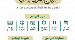 منصور نظام الدين –عبدالله بنجابي : مكة المكرمة:- أوضحت رئاسة الشؤون الدينية بالمسجد الحرام والمسجد النبوي عن إقامة البرنامج القرآني الشتائي في رحاب المسجد الحرام خلال الفترة من 20 إلى 28 رجب 1447هـوأكدت الرئاسة أن أعمال البرنامج ودوراته العلمية ستقام في توسعة الملك فهد عند باب 79 في الدور الأول وذلك خلال الفترة الصباحية من الساعة السادسة والنصف صباحا وحتى …